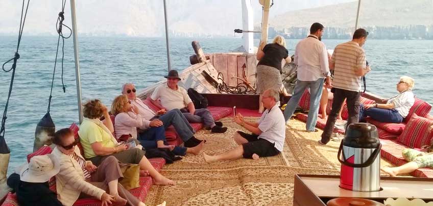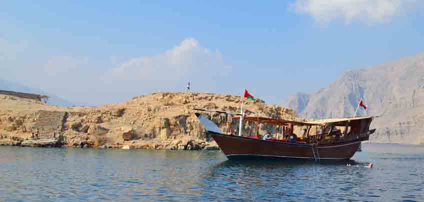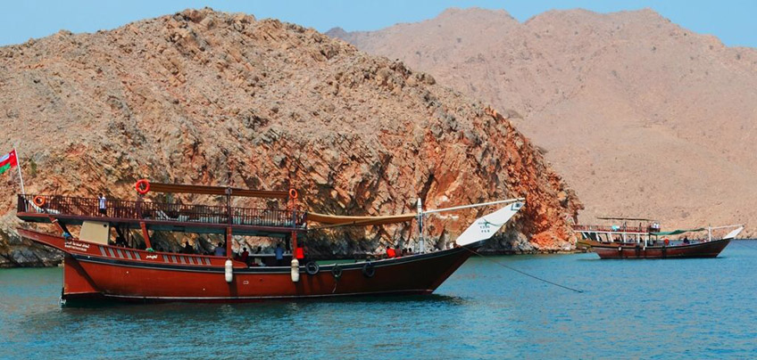 Khasab is the capital of Musandam and it’s popular for Fjords, Coral Reef, colored fishes and Dolphin. The sea here is famous for its rich treasure of seafood and also for its beautiful crystal clear water that provides an ideal place for snorkeling and diving. Going on a Dhow Cruise is a fantastic way to see the spectacular Fjords and the surrounding scenery. Our Dhow Cruise takes you to the Khor Sham fjord where the natural community of dolphins are welcoming you to the silence of sea and we do have two anchoring for snorkel and swimming near to the historical Telegraph Island and the Seebi Island. Swim and snorkel among the colorful sea life and under water life in Telegraph and Seebi is one of the best ways to make yourself happy in the present is to recall happy times from the past. The experience of witnessing the parade of big marine life finning along the edge of a reef wall tends not limited during your Full Day Khasab Cruise with us. The guests will be offered safety jackets and snorkeling kit as a part of the tour and indeed you will have mouthwatering sea food lunch and refreshments on dhow.