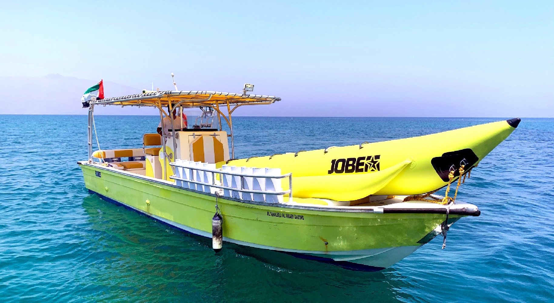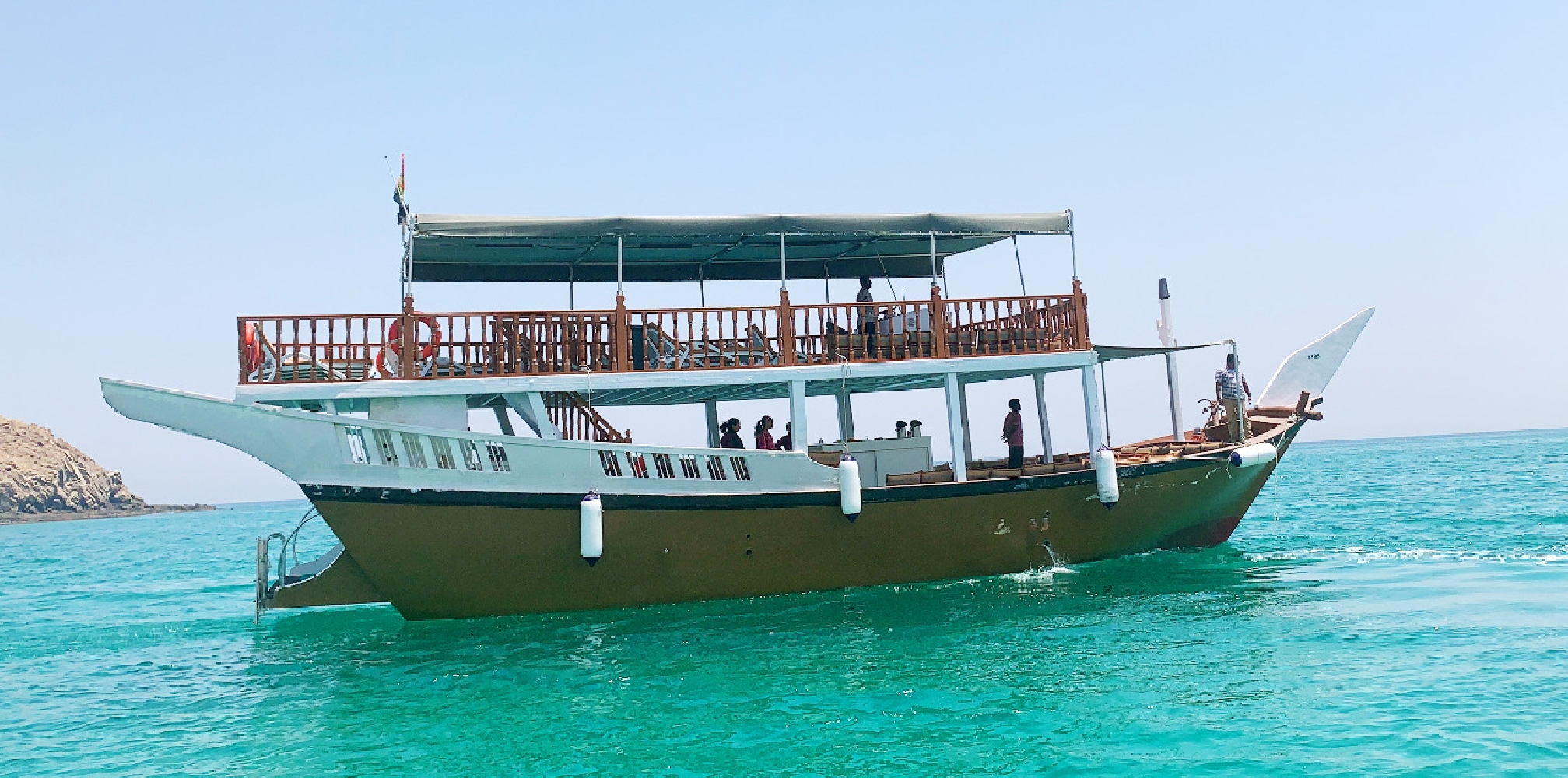 Our Full Day Dhow Cruise taking you in the beautiful sights and wonderful beaches including swimming, Snorkeling and fishing. We do have anchoring for snorkel and swimming near to the beautiful Dibba rock. Swim and snorkel among the colorful sea life and under water near Dibba rock is one of the best ways to make yourself happy in the present is to recall happy times from the past. The experience of witnessing the parade of big marine life finning along the edge of a reef wall tends not limited during your Full Day Dibba Cruise with us. The water sports activities like Banana boat ride/Speed boat ride will give you an unforgettable experience of sea adventure and unlimited memories.